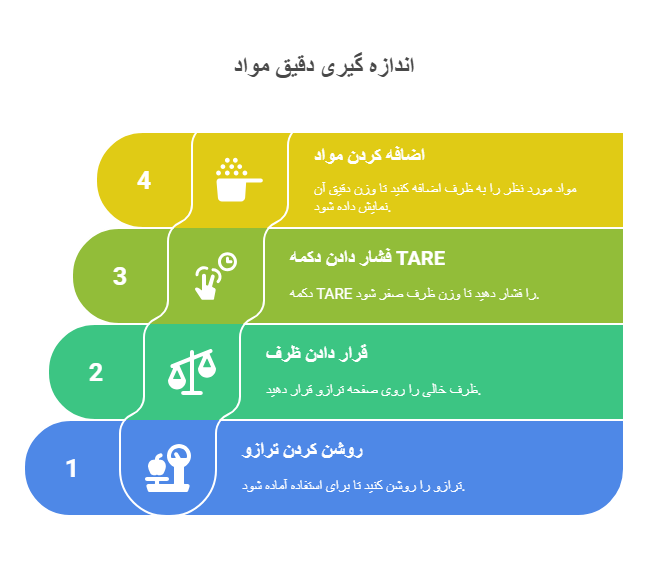 برای مثال، برای پخت یک کیک، میتوانید با استفاده از دکمه TARE وزن ظرف را صفر کنید و سپس مواد مانند آرد (۵۰۰ گرم) و شکر (۳۰۰ گرم) را با دقت ۱ گرم اندازهگیری کنید.