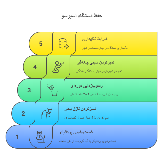 رعایت این نکات ساده اما حیاتی، کیفیت اسپرسوی شما را در طول زمان ثابت نگه میدارد و از بروز ایرادات عملکردی جلوگیری میکند.