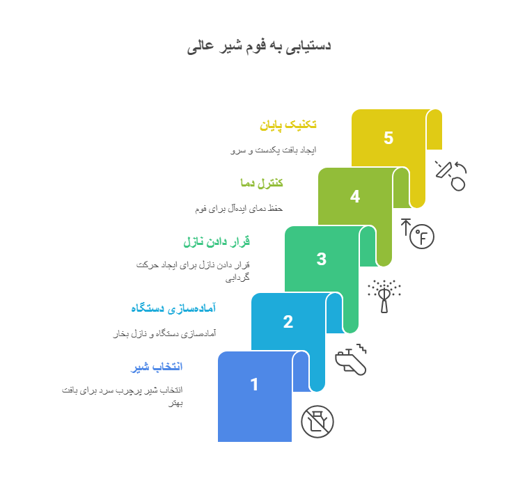 1. نخستین گام، انتخاب شیر مناسب است. بهترین گزینه، شیر پرچرب تازه و سرد است، زیرا چربی و پروتئین بالاتر آن به تشکیل کف غلیظ و پایدار کمک می‌کند. البته می‌توانید از شیر کم‌چرب یا گیاهی هم استفاده کنید، اما بافت و حجم کف ایجادشده معمولاً کمتر خواهد بود. همیشه مطمئن شوید که شیر شما کاملاً سرد باشد (۴ تا ۶ درجه سانتی‌گراد) تا زمان بیشتری برای فوم‌گیری داشته باشید و کیفیت کف بهینه شود.