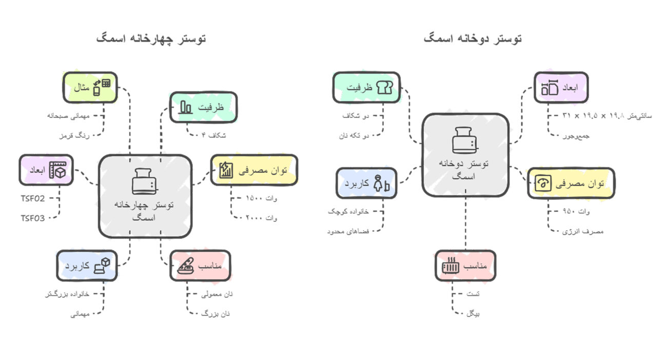 توستر دو خانه اسمگ مدل TSF01 دارای دو جایگاه و توان مصرفی حدود ۹۵۰ وات است که برای خانواده‌های کوچک و استفاده روزمره مناسب است. مدل‌های چهار خانه TSF02 و TSF03 با چهار جایگاه و توان ۱۵۰۰ تا ۲۰۰۰ وات طراحی شده‌اند و برای خانواده‌های بزرگ‌تر یا مصارف پرحجم مناسب‌تر هستند.