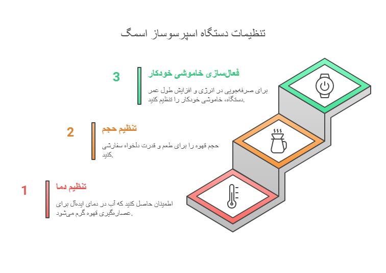 تنظیمات دستگاه اسپرسوساز اسمگ – دما، حجم عصارهگیری و خاموشی خودکار