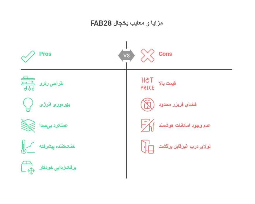 • عدم وجود امکانات هوشمند: برخلاف برخی یخچال‌های جدید بازار که مجهز به اتصال به اپلیکیشن موبایل، کنترل از راه دور و امکانات هوشمند دیگر هستند، FAB28 فاقد این ویژگی‌هاست. این موضوع ممکن است برای کاربران علاقه‌مند به تکنولوژی‌های نوین و کنترل هوشمند خانه یک نقطه ضعف محسوب شود.