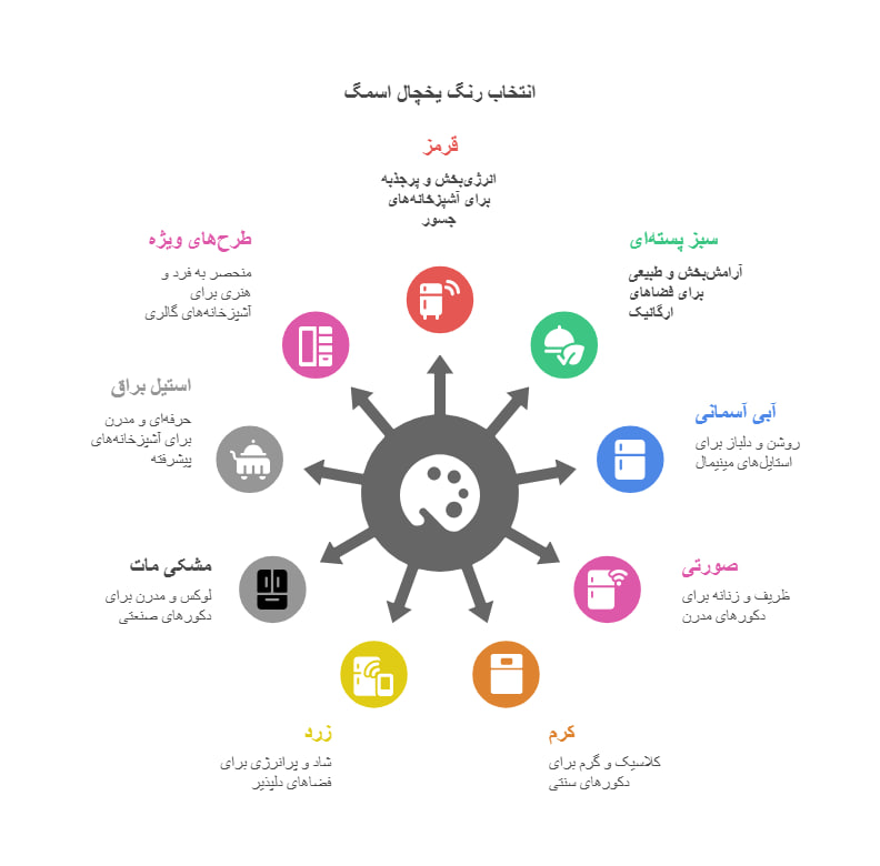 • قرمز: این رنگ انرژی‌بخش و پرجذبه برای آشپزخانه‌های جسور و پویا مناسب است. انتخاب یخچال قرمز اسمگ باعث می‌شود فضای آشپزخانه حالتی شاداب و زنده به خود بگیرد و توجه همگان را به خود جلب کند.