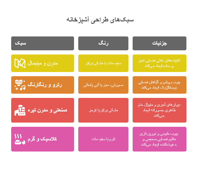 برای ایجاد هارمونی، رنگهای پاستلی مانند آبی آسمانی برای فضاهای روشن و باز، و رنگ مشکی براق برای آشپزخانههای مدرن و صنعتی توصیه میشوند. رنگهای خنثی مثل کرم و سفید برای فضاهای کوچک یا کمنور ایدهآلاند و میتوانند فضا را دلبازتر نشان دهند.