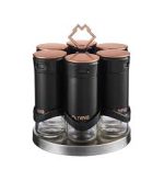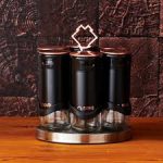 - نوع محصول: مجموعهجا ادویه با استند گردان (rotating spice jar set)؛ معمولاً شامل چند عدد ظرف شیشهای یا شیشه + فلز همراه با پایه گردان.